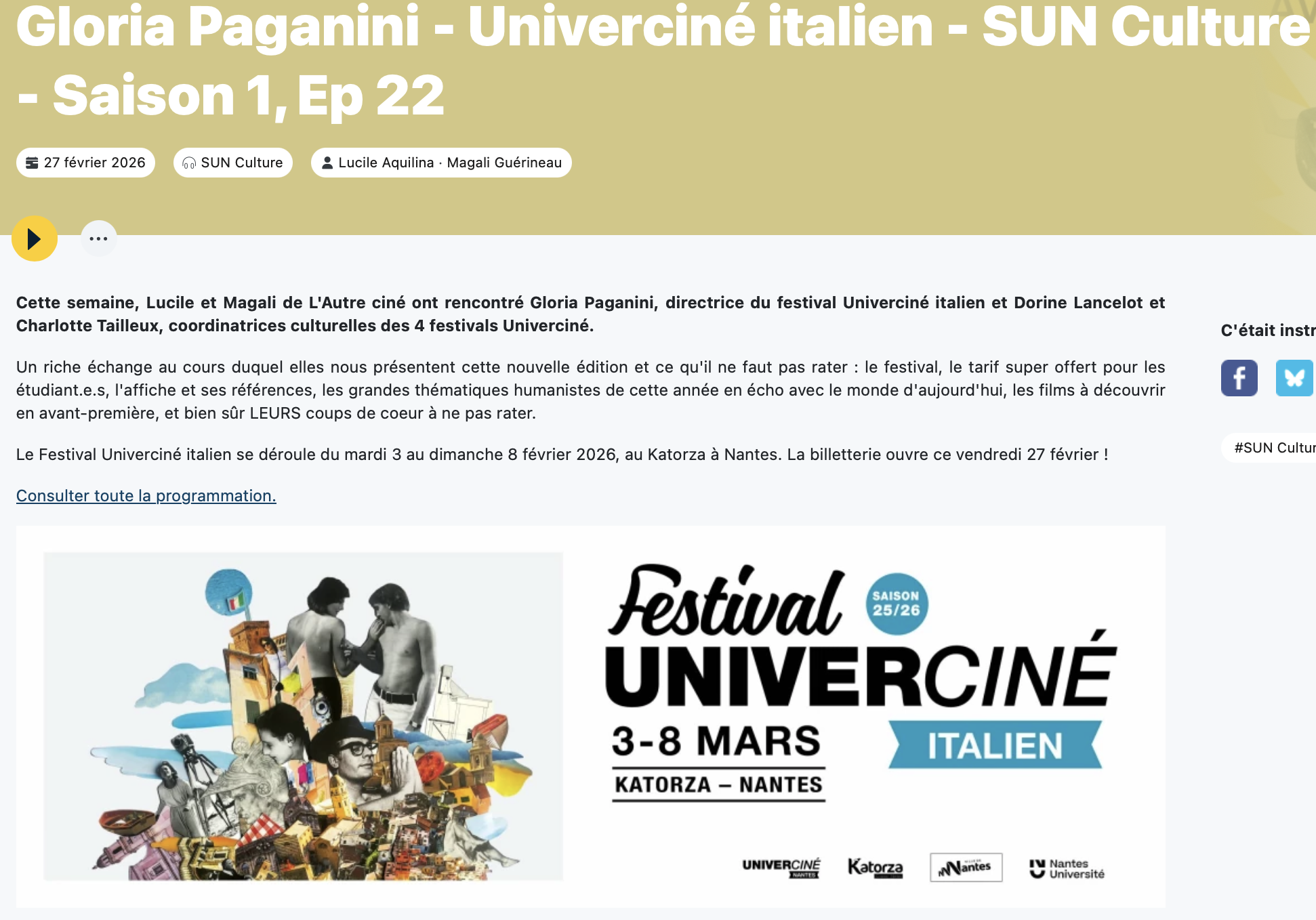 Un riche échange au cours duquel elles nous présentent cette nouvelle édition et ce qu’il ne faut pas rater : le festival, le tarif super offert pour les étudiant.e.s, l’affiche et ses références, les grandes thématiques humanistes de cette année en écho avec le monde d’aujourd’hui, les films à découvrir en avant-première, et bien sûr LEURS coups de coeur à ne pas rater.